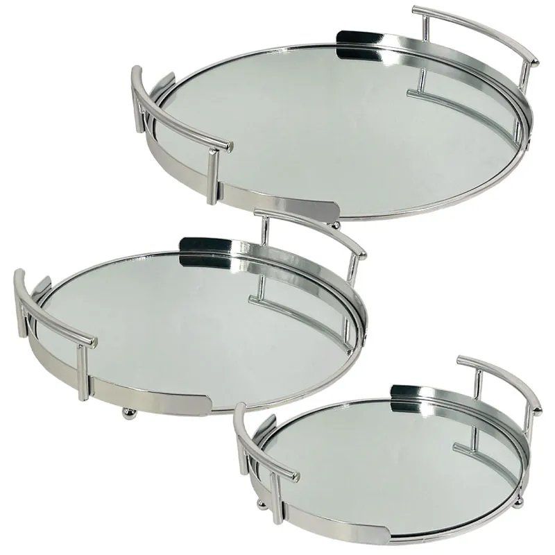 МЕТАЛНИ ПОДНОСИ СРЕБЪРНИ КОМПЛЕКТ/3 КРЪГЛИ С ОГЛЕДАЛО И ДРЪЖКИ - Р: 25, М: 30, Д: 35 см 4/КУТИЯ