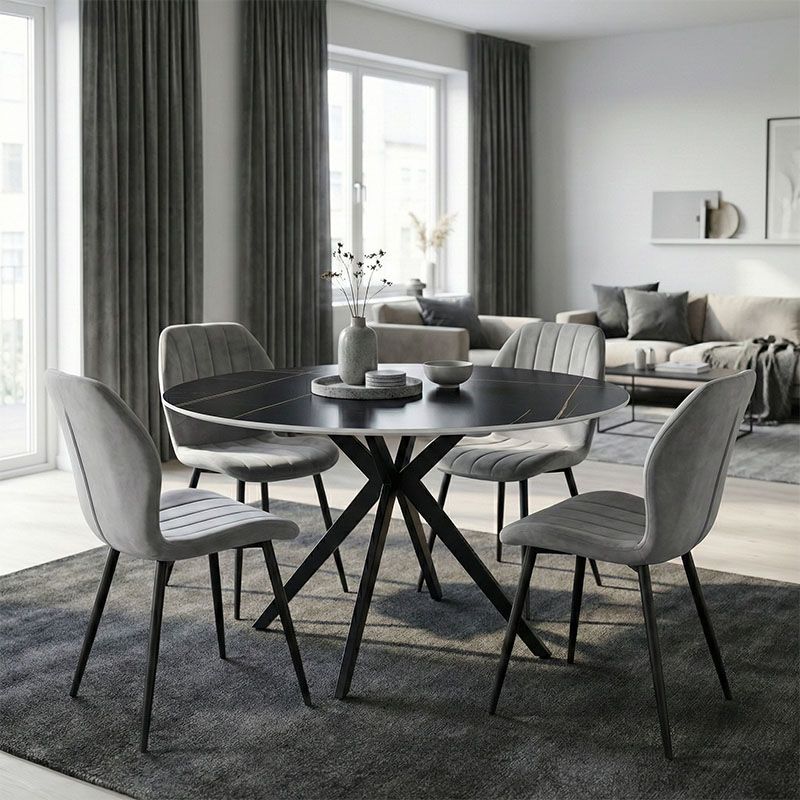 ТРАПЕЗАРИЯ СЪС СИВИ СТОЛОВЕ JELOUR И ЧЕРНА ОРБИТАЛНА МАСА 120X76, КОМПЛЕКТ ОТ 5 ЧАСТИ