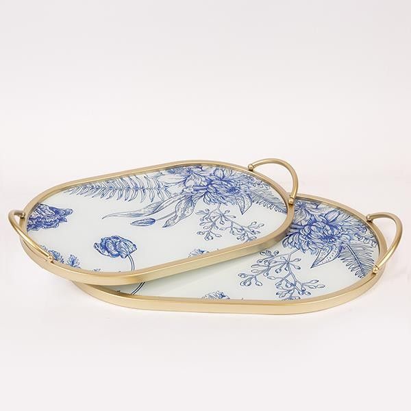 S/2 ПОДНОС МЕТАЛ И СТЪКЛО ЗЛАТИСТО-СИНЬО 47.5X30X6СМ / 40X25X6СМ