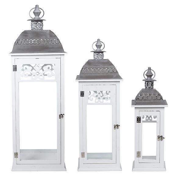 S/3 дървени фенера, бели, метални 33x33x93см / 25x25x71.5см / 17x17x50.5см