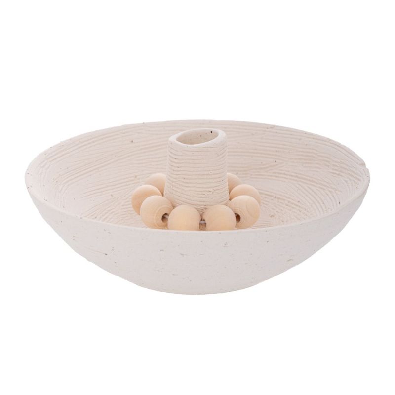 БЯЛ КЕРАМИЧЕН СВЕЩНИК С ДЪРВЕНИ МЪНИСТА 14X14X5,5 СМ