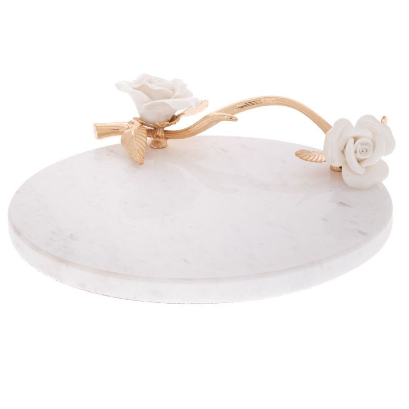 БЯЛ МРАМОРЕН ПОДНОС С ЦВЕТЯ И ЗЛАТНИ ДРЪЖКИ В КРЪГЛА ФОРМА 23X20X5,5 СМ