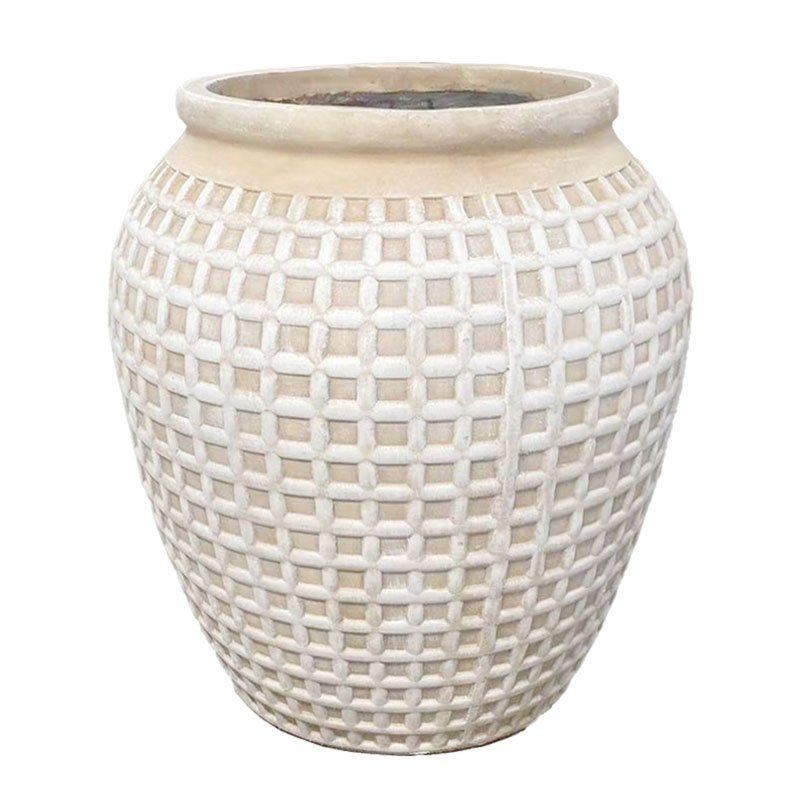 Голяма саксия, изработена от лек кремообразен цимент с изработен модел с мрежа - Φ75x86см