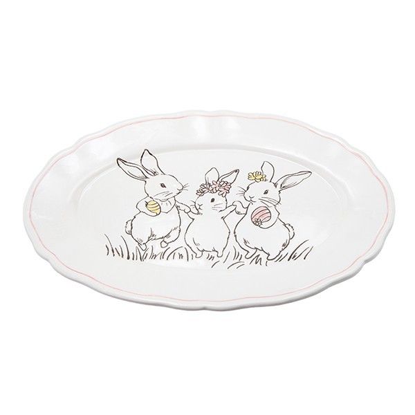 ДЕКОРАТИВНА ВЕЛИКДЕНСКА ЧИНИЯ СЪС ЗАЙЦИ, КЕРАМИЧНА, БЯЛА, 25.7X17.6X1.8СМ