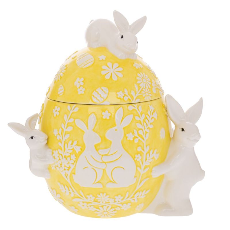 ЖЪЛТ КЕРАМИЧЕН БУРКАН ЗА БИСКВИТКИ С ФОРМА НА ЯЙЦЕ СЪС ЗАЙЧЕТА 25X20X30 СМ