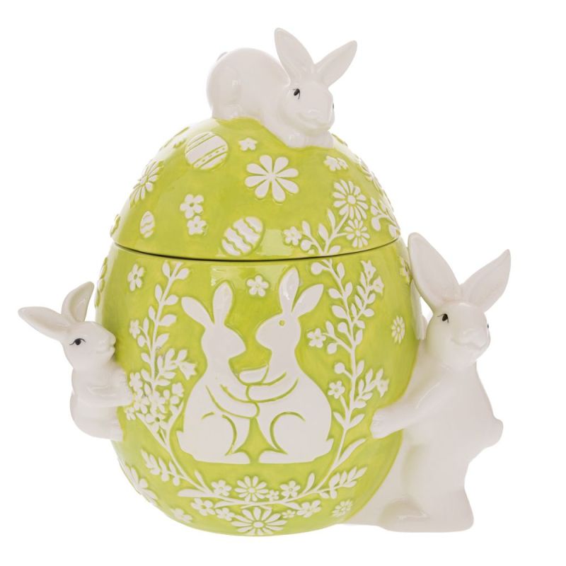 ЗЕЛЕН КЕРАМИЧЕН БУРКАН ЗА БИСКВИТКИ С ФОРМА НА ЯЙЦЕ СЪС ЗАЙЧЕТА 25X20X30 СМ