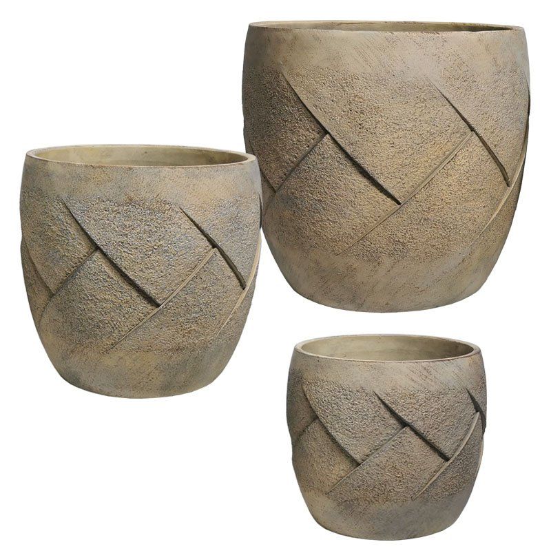 Комплект от циментови саксии/3 кафяви, релефни с кръстосън разтегнат рамк - Д:φ31x30, М:φ25.5x24.5, Ш:φ20x19.5см 54/pal