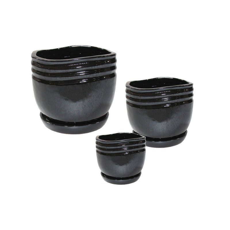Комплект/3 черни кръгли глинени цветя с чинийки - р: Φ14x14, м: Φ19.5x18.5, д: Φ24x23.5 см 2/кутия