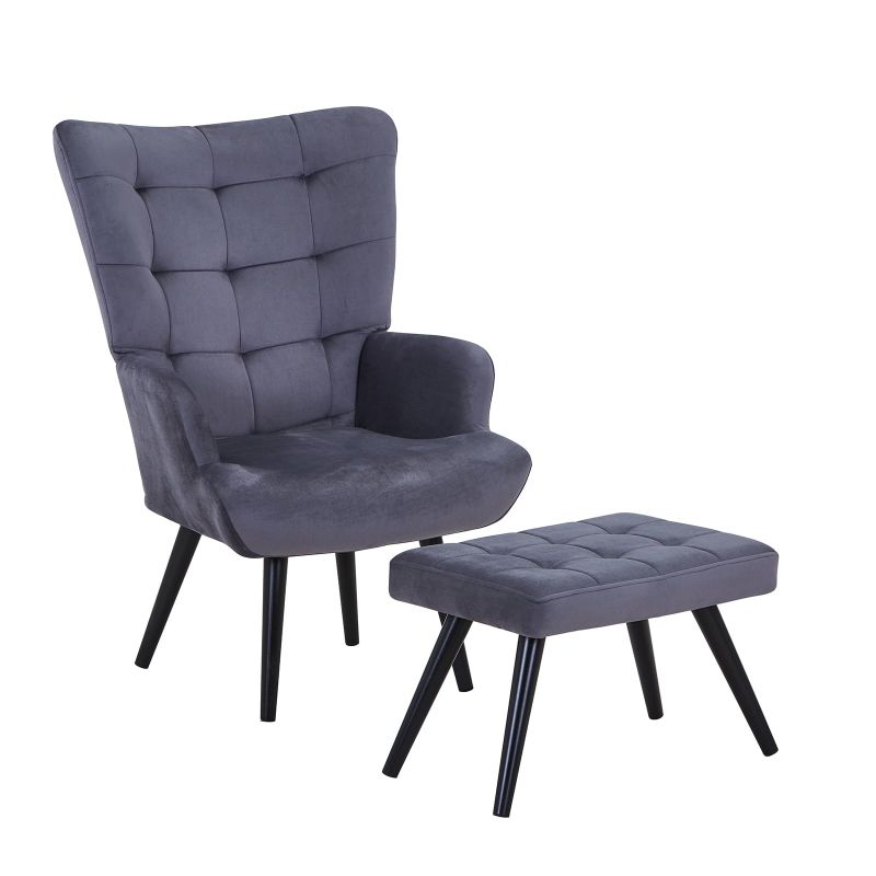 Кресло Lobby - Bergerac с табуретка - поставка за крака, черен метал, тъмносив велуренен плат