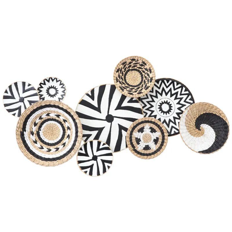 Метално-ракитен покрив за стена, златист/черен/бял/кафяв, кръгове, бохо стил - 107.3x57.8x8.9см 4/kib