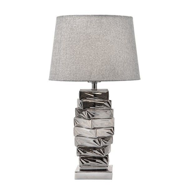 Настолна лампа с абажур от лен, сива керамика - металик сребърна 30x30x51см