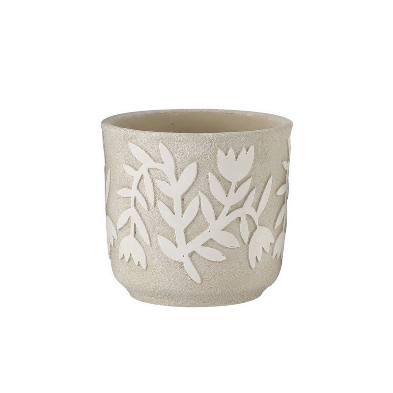 Циментова саксия, кремаво-бежова, кръгла, релефни растения Φ17.5x16см - 1/8kib